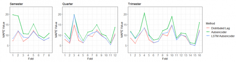 In the semester window shift scenario, the highest MAPE value of the distributed lag method occurs in the fifth fold, with a value of 12.17%. This is not in line with the autoencoder and LSTM autoencoder methods, where the highest MAPE value of the autoencoder method occurs in the first fold with a value of 19.68%, and the highest MAPE value of the LSTM autoencoder method occurs in the second fold with a value of 11.95%. Meanwhile, the lowest MAPE value in the distributed lag method appears in the third fold with a value of 6.98%. This is not in line with the Autoencoder and LSTM autoencoder methods, which have the lowest MAPE values in the seventh fold. The MAPE values of these two methods in these folds are 8.56% and 7.47%, respectively.