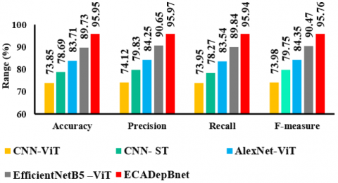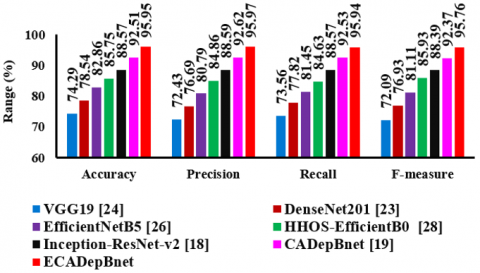 In this section, the comparative analysis is carried out between proposed ECADepBnet model and the existing models like DenseNet201 [23], VGG19 [24], EfficientNetB5 [26], HHOS-EfficientB0 [28], Inception-ResNet-v2 [18] and CADepBnet [19]. All these existing models are evaluated on benchmark dataset in section 3.1.