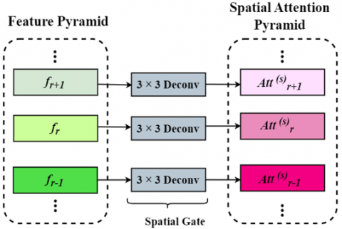 Spatial Gate and Spatial Attention Pyramid: Every building block in the pyramid spatial attentions is regarded as input and generates spatial attention mask $A t t_r^{(S)}$. To extract spatial information, each feature map $f_r$ passes a 3 × 3 deconvolution layer with one output channel separately. Figure 3 shows the structure of spatial attention pyramidal. Each element of the spatial attention mask $A t t_r^{(S)}$ is then normalized to the interval (0,1) indicating spatial significance as in Eq. (1):