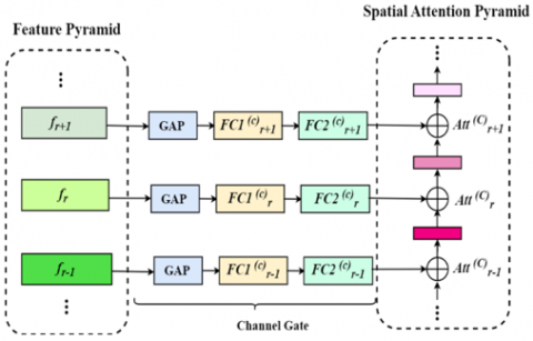 Channel attention pyramid and Gate: By using global average pooling (GAP) and two FC layers, the Channel attentions $\left\{A t t_n^{(C)}, A t t_{n+1}^{(C)}, \ldots, A t t_{n+N-1}^{(C)}\right\}$ are obtained from matching feature maps in the feature pyramid [30]. Eq. (2) presents the channel attention mask.