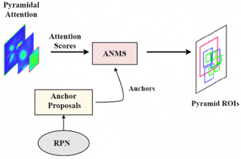 According to the RPN approach, the spatial attention masks will function as anchor scores instead of multi-scale feature maps to identify discriminative regions supervised manner. In this approach, anchor proposals are assigned a uniform scale and aspect ratio at each pyramidal level based on their convolutional receptive field. Subsequently, ANMS will be implemented on the evaluated proposals to minimize redundancy by removing excessively covered image areas and preserving visual integrity by consolidating related proposals to identify the increased discriminative regions within the images. Algorithm 1 illustrates the ANMS methodology.