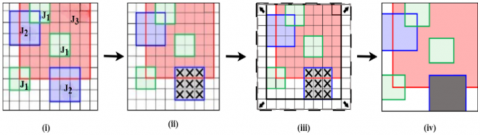 where the bilinear up sample operation is denoted by $\varphi$. For the final bird species categorization, the fully connected layer of Inception-ResNet-v2 receives the refined characteristics $M B_n$. The ROI refinement model is demonstrated in Figure 6. In Figure 6, (i) a low-level feature map $Y_n$ is presented with ROI pyramid $J_{R P}$ as $J_1, J_2$ and $J_3$ for instances; (ii) ROI- Dropblock; (iii) ROI-merge block operation; and (iv) a refined feature map $M B_n$ with background noise removed and local areas masked. The gray rectangle denotes the dropped region, while the other coloured rectangles indicate different levels in the pyramidal system. Algorithm 2 illustrates the framework of ROI Refinement Model.