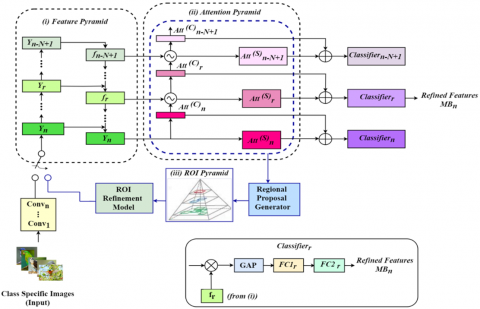 In above Eq. (1), σ and * devised a sigmoid function and deconvolution operation. $K_c$ is the convolution kernel. In consequence, spatial attention pyramid $A t t_n^{(S)}, A t t_{n+1}^{(S)}, \ldots, A t t_{n+N-1}^{(S)}$ supplied using multi- scale feature maps. Then, the channel attention pyramid then contains these spatial activations for creating the picture ROI pyramid and doing additional feature refining.
