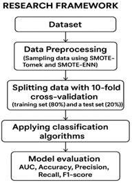 To tackle the challenges of imbalanced datasets, this study employs a hybrid resampling approach that combines oversampling and undersampling techniques, specifically SMOTE-Tomek and SMOTE-ENN. The SMOTE-Tomek technique merges the Synthetic Minority Over-Sampling Technique (SMOTE) with Tomek Links to increase the representation of the minority class while eliminating majority class samples near the decision boundary, thereby enhancing class separability and reducing noise [4, 5]. SMOTE-ENN, which integrates SMOTE with Edited Nearest Neighbor (ENN), further reduces misclassified instances, enhancing predictive accuracy [6]. Both techniques have improved classification performance, particularly in noisy or borderline instances, by balancing class distribution and minimizing overfitting [7, 8].