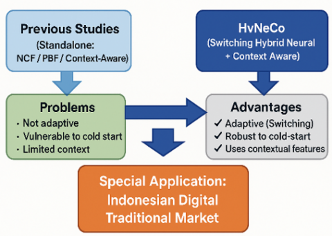 Most existing research has focused on single-method solutions, such as NCF, popularity-based filtering, or context-aware embeddings, rather than integrating all three simultaneously. Moreover, few systems implement dynamic, adaptive switching mechanisms [22]. This study addresses these gaps by proposing HyNeCo, a hybrid neural recommender framework that combines the predictive power of NCF, context-aware popularity filtering, and adaptive switching tailored to digital traditional markets. Figure 1 illustrates this gap by mapping prior approaches against HyNeCo’s proposed framework.