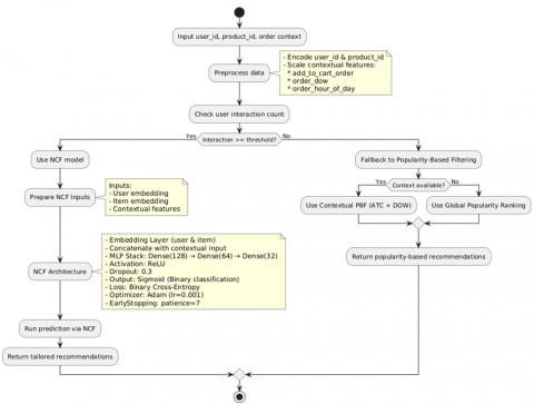 A dynamic, rule-based switching mechanism determines which model is deployed for each user. Users with five or more prior interactions are routed to the NCF engine, whereas users below this threshold are served by the contextual PBF module. More generally, if interaction_depth $(u) \geq \tau$ and the available context supports personalised ranking, user $u$ is routed to the NCF head; otherwise, user $u$ is routed to the PBF head, where item priors are modulated by day of week, hour of day, and add_to_cart_order. The threshold $\tau$ is a tunable hyperparameter.