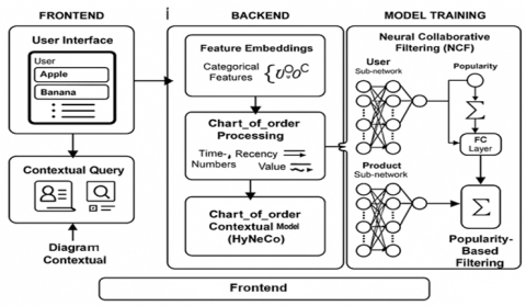 To address this gap, this study proposes HyNeCo (Hybrid Neural Contextual Recommender), an adaptive deep learning-based recommendation framework that combines Neural Collaborative Filtering and context-aware popularity-based filtering within a dynamic switching architecture. The model adjusts its recommendation strategy based on user interaction density and behavioural context, including order time, transaction day, and in-basket position. Unlike prior hybrid models that typically rely on static, threshold-based switching, HyNeCo incorporates contextual features directly into the switching mechanism. The proposed framework is designed to support deployment in digital platforms serving micro-enterprises and traditional vendors where data availability is limited. By accounting for Indonesia’s shopping behaviour and market rhythms, HyNeCo aims to produce more contextually relevant recommendations in practical settings. Overall, this study contributes an adaptive, context-aware recommender architecture to support the inclusive digital transformation of Indonesia’s informal commerce ecosystem [10].