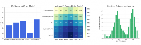Figure 5. ROC curves, hour-wise F1 heatmap, and hourly recommendation distribution; peaks align with user activity