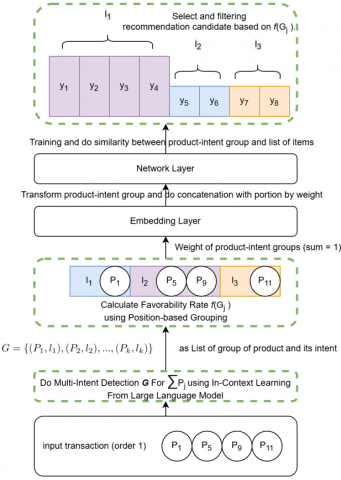The primary task is to detect groups of latent purchase intents $G$ underlying the transaction, represented as $\left(P_1, l_1\right), \ldots,\left(P_k, l_k\right)$ where $P_j \subseteq T$ and $l_j$ is the intent label assigned to the product subset $P_j$. In addition to intent detection, the system is designed to compute the user's preference level $f\left(G_j\right)$ for each intent group $G_j$, using a score-based ranking mechanism derived from item ordering. A summary of notations used is provided in Table 1.