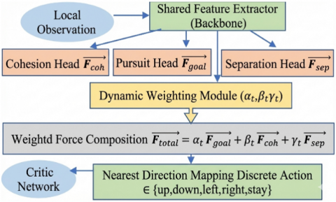 In parallel, a dynamic role-weighting module, implemented as a separate branch with a softmax activation, generates a triplet of normalized behavioral weights $\left(\alpha_t, \beta_t, \gamma_t\right) \in[0,1]^3$, subject to the convexity constraint: $\alpha_t+\beta_{\mathrm{t}}+\gamma_t=1$. These weights adaptively modulate the relative influence of each control primitive based on the agent's local context, thereby supporting dynamic role allocation. The final continuous control vector is then obtained as follows: