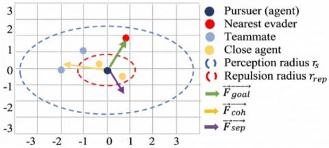 Separation Force ($\overrightarrow{F_{{sep}}}$): Outputs a force vector that repels the agent from nearby pursuers to prevent overcrowding and collisions [27].