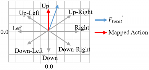 Since the pursuit-evasion environment operates on a discrete grid, $\overrightarrow{F_{\text {total }}}$ is discretized into one of the available movement actions $\mathrm{A}=\{$up, down, left, right, stay$\}$ using a nearest-direction mapping.