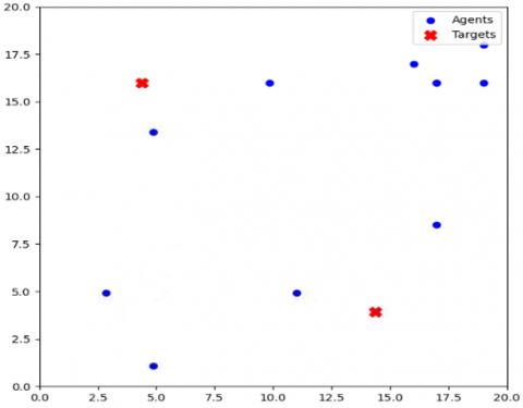 At the collective level, coordination metrics demonstrated structured group behaviors, including reduced collision rates, compact clustering around evaders, and spontaneous emergence of encirclement and blocking formations. These dynamics are exemplified in Figure 10, Multi-agent simulation demonstrating emergent cooperative coordination and encirclement of evaders, which visually depicts how agents self-organize into cohesive formations to contain the targets. Such patterns were absent in the DQN, PPO, and standard DDPG, underscoring the distinct advantages of the proposed architecture.