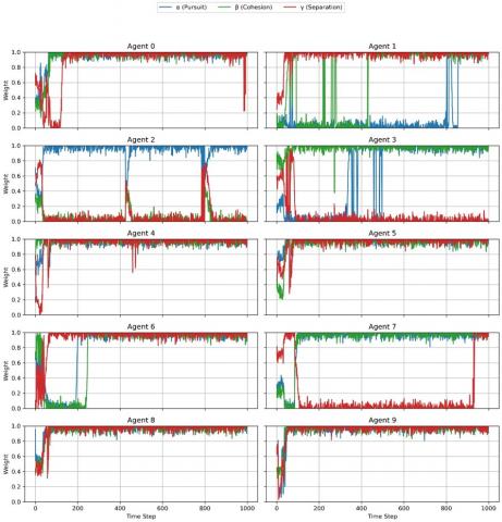 We assessed whether the proposed Multi-Head DDPG facilitates emergent self-organization through both individual and collective analyses. At the agent level, the temporal trajectories of role weights (α, β, γ) indicated heterogeneous specialization, with some agents consistently prioritizing pursuit, while others emphasized cohesion or separation. Crucially, these roles are not predefined but emerge autonomously from decentralized interactions under partial observability.