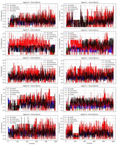 Three salient observations emerge from this analysis. First, separation consistently accounted for the largest share of the force budget. As illustrated by the recurrent peaks of ||F_sep|| (often in the range of 3-4) for Agents 5-9, collision avoidance dominated when the agents operated in congested configurations. In contrast, ||F_goal|| and ||F_coh|| remained comparatively smaller (typically below 1.5), except during sparse regimes or post-dispersion phases. Second, despite the high variability in the primitive forces, the resultant ||F_total|| exhibits smooth temporal evolution, demonstrating that the weighted coupling acts as a stabilizing mechanism. This effectively ensures coherent motion policies and mitigates the risk of erratic behavior. Third, the modulation of role weights directly reflects context-sensitive adaptation: pursuit forces weaken when agents close in on targets, whereas cohesion and separation forces increase under high-density interactions, consistent with transient rises in β and γ.