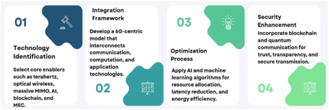 Integration framework constitutes the second step, which formulates a 6G-centered model interlinking the communication, computation, and application layers so as to ensure smooth interoperability [21]. Optimization Process, the third step, applies AI and ML plans for optimizing resource allocation, reducing latency, and improving energy efficiency. Security Enhancement, through the addition of blockchain and quantum communication, ensures trust, transparency, and secure data transmission in the final step. This systematic approach delineates the way in which heterogeneous technologies cooperate for the creation of intelligent, dependable, and secure 6G networks enabling next-generation applications [22].