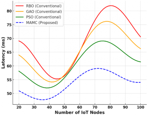 Eq. (4) is the underlying optimisation function for determining the best configuration of the IoT system. This minimises the latency as well as the energy consumption and maximises the throughput as much as possible, which demonstrates the multi-objective nature of the optimisation for the 6G IoT. This allows for balanced weighting between each of the respective measures of performance so the chosen configuration optimally balances efficiencies, speed, and reliability during real-time usage [33].