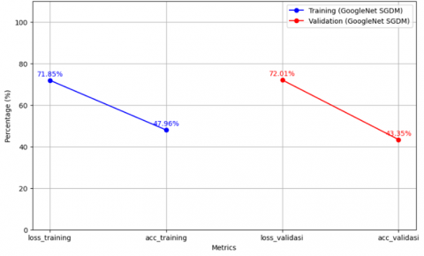 The test results in Figure 10, obtained using the GoogleNet model with the SGDM optimizer, indicate that the model performs reasonably well on the training data, with an accuracy of 47.96% with a loss of 71.85% is achieved. Furthermore, the model demonstrates satisfactory performance on the validation data, reaching an accuracy of 43.35% and a loss of 72.01%. These results suggest that the model can effectively extract meaningful learning patterns from the training data, but still requires further improvements to reduce loss and increase accuracy on both the training and validation data.
