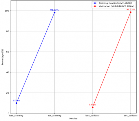 Regarding the loss, Figure 11 shows a value of 5.80%, reflecting a low error rate during training. Moreover, the model attains an accuracy of 98.52%, demonstrating its strong capability to classify tuberculosis images with high precision. Besides high accuracy, the GoogleNet model also shows excellent results in terms of precision, recall, and F1-Score, each reaching 98.52%. Precision measures the accuracy of the model's positive predictions, while recall measures how well the model finds all positive instances. The F1-Score is the harmonic mean of precision and recall, providing an overall picture of the model's performance in classification. Not only in terms of prediction quality, but the GoogleNet model also demonstrates efficiency in training time. With only about 76.04 seconds required to train the model, it shows that this model is not only accurate and consistent but also efficient in the use of computational resources, as shown in Table 2.