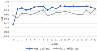 The results presented in Figure 8, obtained using the GoogleNet model with the RMSProp optimizer, indicate that the model attains 89.74% accuracy on the training data, accompanied by a loss of 25.66%. Its performance on the validation data is likewise highly satisfactory, reaching an accuracy of 95.57% and a loss of 14.80%. These outcomes suggest that the model is able to learn from the training data exceptionally well and maintain high performance on the validation data, demonstrating strong generalization capabilities.
