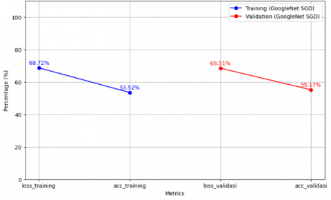 The results presented in Figure 9, obtained using the GoogleNet model with the SGD optimizer, indicate that the model performs reasonably well on the training data, an accuracy of 53.52% and a loss of 68.72% are obtained. In addition, the model demonstrates comparable performance on the validation dataset, with an accuracy of 55.17% and a loss of 68.51%. These findings suggest that the model is successfully learning from the training data and shows stable performance on the validation data, although further improvements are needed to increase accuracy.