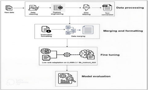 Training process followed these hyperparameters: total batch size of 2 per device with gradient accumulation steps = 4 so the total batch size is 8, learning rate of 2 × 10-4, 2 epochs, maximum sequence length of 4096 tokens, and a warmup rate of 0.01 with weight decay of 0.01. Optimizer: AdamW (8-bit). Quantization: 4-bit.