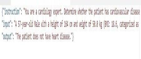 All pre-processed datasets were unified into a single dataset as a JSONL format (Cardiac_10sft) ensuring the instruction format for fine-tuning. The jsonl format is ideal for large datasets where each line is a separate JSON object and compatible with any large language model training tools like LoRA and PEFT.