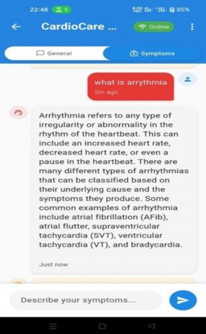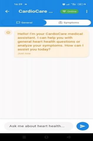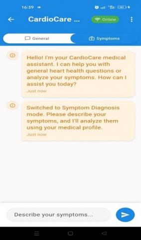 The frontend of the application was developed using Flutter. The frontend serves as the primary interface between the user and the backend AI diagnostic engine. It allows users to input their symptoms (see Figure 9), edit their profile (see Figure 10), review their medical history (see Figure 11), monitor simulated vital signs (see Figure 12), and receive structured clinical diagnosis generated by our 'LLM-Cardio' (see Figure 13).