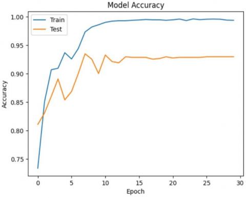 Figure 2 shows how the proposed CNN model learns over time. Figure 2(a) shows that the training and validation losses are getting closer together, Figure 2(b) that accuracy in training grows quickly and levels off to approximately 99, and testing accuracy levels off at approximately 93. The narrowness of the gap between them shows that there is good model generalization with low overfitting.