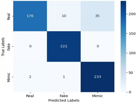 The detailed classification performance across the three classes—Real, Fake, and Mimic—is illustrated in Figure 3, which presents the confusion matrix. It clearly shows that the model achieves high recall for Fake and Mimic classes while slightly lower recall is observed for Real samples.