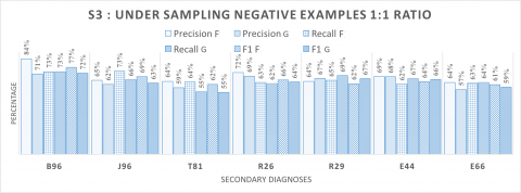 Scenario 3. Figure 5 shows the results of the third scenario. Clear improvement can be observed in the quality of detection of all secondary diagnoses. Compared to the results presented in Figures 3 and 4 in which the used sampling methods privileged B96 and J96 diagnoses, this evaluation substantiates that sampling negative examples according to 1:1 ratio is the best method to predict a right quality over all type of secondary diagnoses. In fact, the results show that the values of the quality measures range between 55% and 84%, which are very trustworthy to satisfy our main objective. The difference of each sampling methods can be observed clearly in Figures 6, 7 and 8, each figure shows the performance and the differences between the sampling methods using the metrics F1, Precision and recall in order.