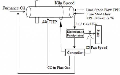 In this process CO2 from the Calcium carbonate in feed is removed along with flue gas through the stack attached to the lime kiln at the back-end. Electrostatic precipitator at the back-end of the kiln is primarily for removing the particulates in the flue gas. The product discharged shall be of high purity (80 to 81 % as CaO). Depending on the moisture in lime mud and the feed flow, the oil consumption would vary. Due to the varying complexities associated with Lime mud, properties cannot be measured online. The samples of feed and fuel oil have to be sent to in house mill laboratory for detailed analysis and composition [33]. The amount of time spent on the same is significant and the delay associated with estimating the actual value would not help in correcting other dependent parameters such as fuel and air flows and excess oxygen concentration in air supplied.