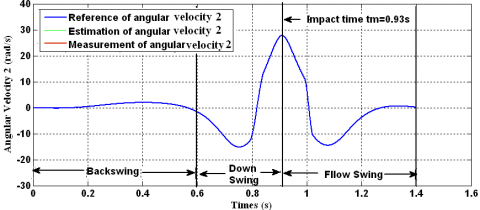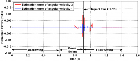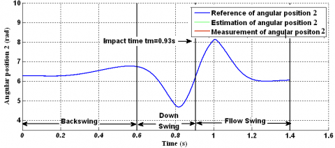 The evolution of estimated angular positions (see Figure 5 and Figure 6), and the estimated angular velocities (Figure 7 and Figure 8) follow the reference trajectories. Figure 9 and Figure 10 represent the estimation error of the positions and the velocities for both joints, respectively. These estimation errors are kept within a small variably rang and converge very quickly to zero in the backswing and follow through phases. However, in the downswing period, which represents the hyper dynamic motion, we can observe a slightly larger error around the impact time. This error is due to the non-linear structure of the joins stop. Because the sign switching function is applied in the observer structure, and the obtained error values always oscillate in a very small rang around zero, even after state estimations have already converged to the real states.