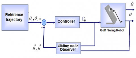 The golf swing motion control outstanding interests many researchers. For example, Xu et al. [14] applied a PID controller to reduce the robot's tracking error. Studies from Xu et al. [18] and Xu et al. [19] reported that an energy controller is adopted to realize a specified hitting speed at the impact position in the swing. Meanwhile, for the stopping problem that arises from follow-through, a PD control and PD plus Gravity and Coupling Torque Compensation (PGCTC) feedback control taken into smoothly slow down and stop swinging at a specified finish position. Others, conventional controllers devoted to robotics have also been tested [20]. However, not all of these conventional controllers can overcome the internal and external disturbances, which influence the behavior of robot . In our previous work [20], a sliding mode controller, a backstepping controller and a hybrid controller were applied to the robot which combines sliding mode with backstepping are proposed. Nevertheless, these control laws are based on complete state feedback. However, in many practical situations, the joint angular velocities are obtained either by differentiating the measured joint angular positions or through tachymeter. In both cases, the velocity signal is contaminated by the noise. This can reduce the dynamic performance of closed-loop robot systems and influence its stability. To overcome this problem, the $H_{\infty}$ observer was used to estimate joint angular velocities [21].