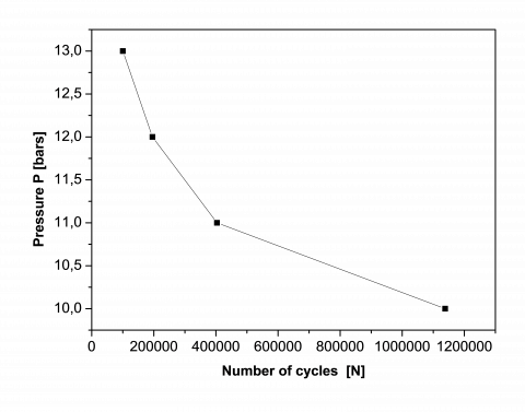 Moreover, in Figure 5, we have plotted the variation of internal pressure versus of cycles to failure (Nf). According to this figure the short fatigue lifetime is caused by the high internal pressure applied. We observed a stabilization of the lifetime for a pressure low than the value P=10 bars. Furthermore, that there is a critical internal pressure applied beyond which the fatigue lifetime decreases significantly. When the internal pressure applied of the pipe exceeds this critical pressure there it will be bursting. Several studies [1, 4, 6, 8-10, 20, 22, 23, 25] can be remarked the phenomena.