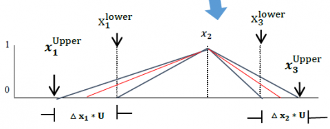 The uncertainty (U) in the membership functions is the third considered parameter. we need to avoid overlapping between: $\mathrm{x}_{1}^{\text {lower }}$ and $\mathrm{x}_{3}^{\text {lower }},$ so, we propose: $\mathrm{U} \in[\mathbf{0}, \mathbf{1}] \Rightarrow \Delta \mathbf{x}_{1} * \mathbf{U} \leq$$\Delta \mathbf{x}_{1}$ and $\Delta \mathbf{x}_{2} * \mathbf{U} \leq \Delta \mathbf{x}_{2}$