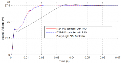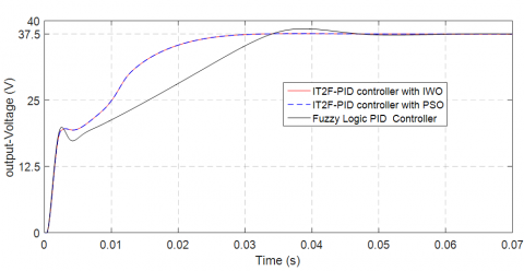 The Invasive weed optimization (IWO) algorithm converges quicker than the Particle Swarm Optimization algorithm (PSO) (Figure 13 and Figure 16). The superiority of the IT2F-PID controller with IWO comparing with both the IT2F-PID controller with PSO and fuzzy Logic PID controllers(Figure 15, Figure 18, Table 6 and Table 8), where: the IT2F-PID controller with IWO has minimum the Rise time (Tr), achieve lower the integral of square of errors (ISE) and the integral of the absolute errors (IAE) comparing with the other controllers. Finally; Invasive Weed Optimization Algorithm is helpful to tuning the PID values and the footprint of uncertainty size (FOU) in Interval Type-2 fuzzy logic PID controller for Boost DC-DC Converter.