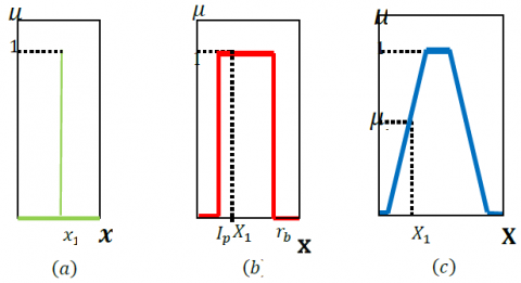 Figure 1. Membership functions (a) singleton, (b) Interval Type-1, (c) Type-1