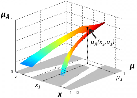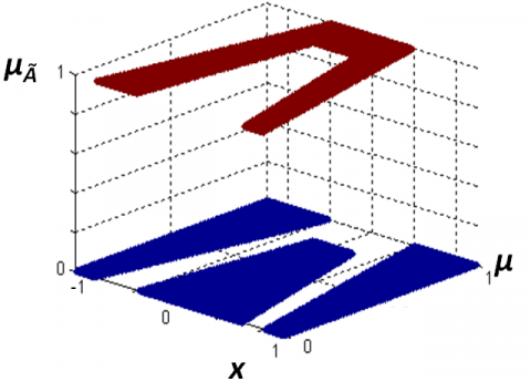 Type-1 fuzzy MFs (T1-MF) are two dimensional and represent the membership degree μ for a variable x. Type-2 fuzzy MFs (T2-MF) are three dimensional: