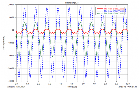 According to the above parameters, a dynamic simulation model was configured: the number of simulation steps, 500; the simulation time, 10 seconds. Based on the displacement driving curve, the force curves of the cylinders and the ball hinges were obtained (Figures 10 and 11).