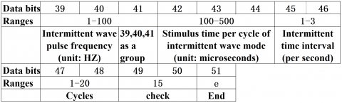 The wearable ESR device adopts the latest Bluetooth 5.0 technology to communicate with the smartphone of the patient. The operation and parameter output of the device are controlled by 51 characters, which represent each parameter index. Figure 16 illustrates the parameter control of the wearable ESR device, and Figure 17 defines the data bits and value ranges of parameters.