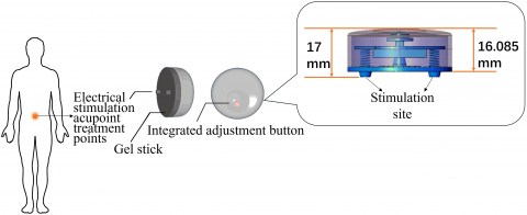 As shown in Figure 6, the designed ESR device is 40mm in diameter and 17mm in height. The device can be applied on acupoints via a magnetic electrode combined with a gel sheet. Bluetooth multi-pass control was adopted to control multiple acupoints simultaneously. In this way, the proposed device could provide personalized electrical stimulation to each patient, in the light of the results of symptom differentiation.
