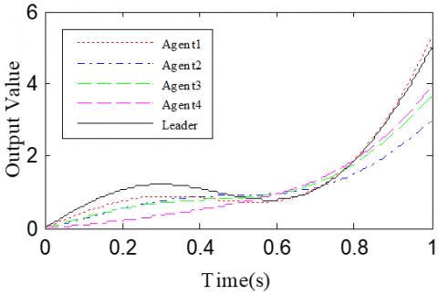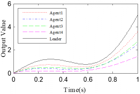 The desired trajectory of the agent can be described as $y_{d}(t)=2 t^{2}+3 t^{3}+\sin (2 \pi t), t \in[0,1]$. During the simulation, the fractional derivative was set as α=0.85. For each agent, the initial state and initial input in each iteration were set to zero: u0,j(t)=0, xi,j(0)=0, and j=1, 2, 3, 4.