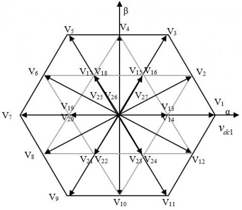 For a three-level converter, there are 18 discrete positions, distributed over two hexagons, in addition to a position in the center of these hexagons. The positions of the output vector in the internal hexagon are created by two redundant states.
