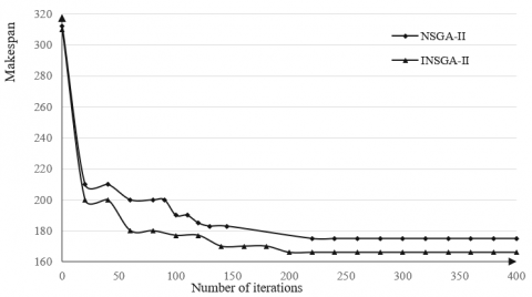 The improved fast elitist nondominated sorting genetic algorithm II (INSGA-II) was employed to solve the multi-objective JSP.