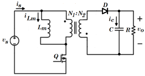 Figure 1 shows the simple structure of the flyback converter. It consists of one switching transistor on the primary side of the isolation transformer which connected to the input voltage and one diode and one capacitor which connected to load on the secondary side. In continuous conduction mode, this converter has two switching states. In the first state, the transistor is on and the diode is off therefore the magnetizing inductance of the transformer would be energized by the input voltage and in the second state of the switching interval, the switch in off and the diode is on therefore the energy of the magnetizing inductance will be transferred to load.