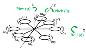 The Figure 3 presents the adopted octocopter’s diagram, from which we can deduce the following equations:
