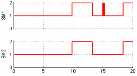 Figure 9 represents the normal evolution of the continuous and the discrete states. When the conditions are satisfied the system jumps from a mode to another. In order to simulate the system in all modes the simulation time is fixed at 20s.