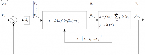The well-known approach for forming the previous system's feedback linearisation law is shown in Figure 6 [20]. The problem of determining the system's vector relative degree (13) necessitates differentiation of each output signal until one of the input signals is explicitly included in the differentiation. We define rj as the minimal integer for each output signal that has one input in $y_{j}^{\left(r_{j}\right)}$ [9]: