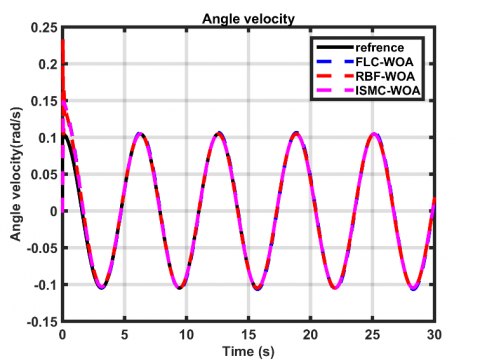 It is clearer from Figure 12 that the angle velocity rapidly reach its sinusoidal trajectory reference for all control approaches. The FLC-WOA and ISMC-WOA provide height performance with tracking trajectory minimum overshoot as compared to RBF-WOA.